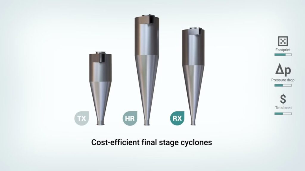 Available in mechanical (ReCyclone® MH) and electrostatic (ReCyclone® EH) versions, the system combines traditional cyclone separation with an innovative recirculation chamber that reprocesses remaining particles, achieving efficiency levels comparable to bag filters or electrostatic precipitators.